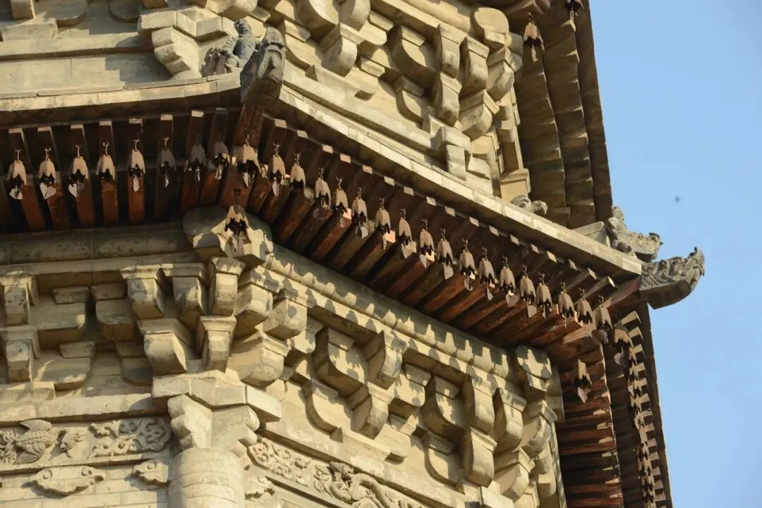 九级密檐,下设斗拱,上铺琉璃,转角脊兽: