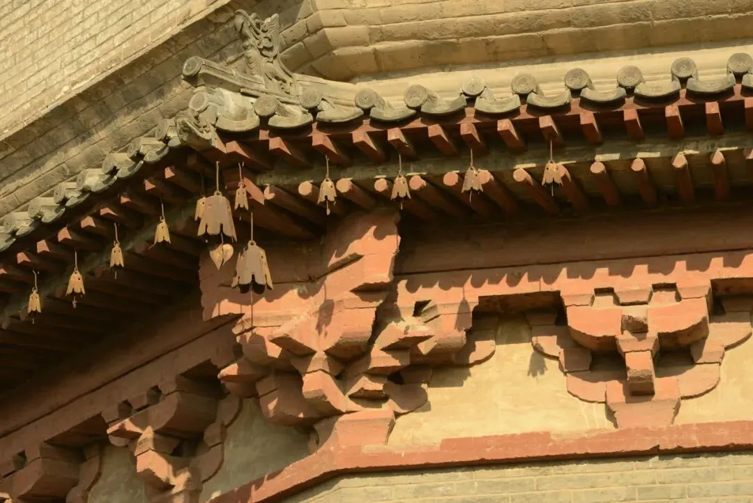 一层,拱门盲窗、半圆倚柱、如意云头、出头阑额、转角加一补间铺作:
