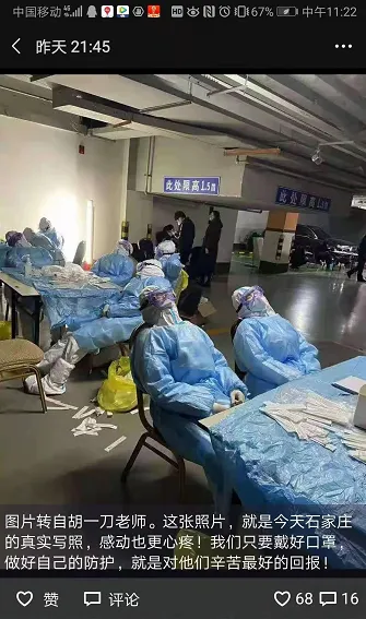 @映山红:“一夜之间,石家庄所有小区闭环管理,医护人员上门核酸检测!向工作在一线的医务人员致敬!1100万人口的城市三天做完核酸检测简直是奇迹。一座城,一条心,团结一致,相信石家庄一定能挺过去的!石家庄加油!”