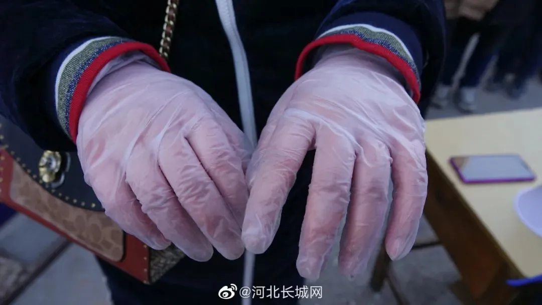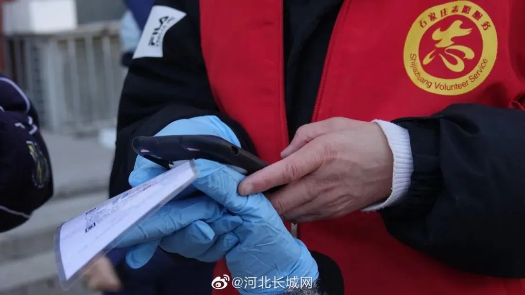 凌冽的寒风中,石家庄工作人员已四五个小时坚守岗位,帮助录入信息、维持秩序,双手冻得通红。