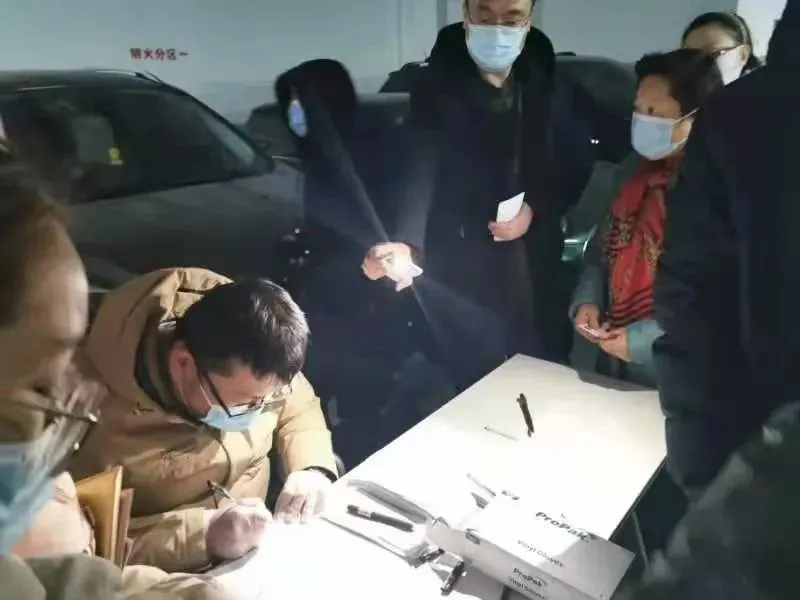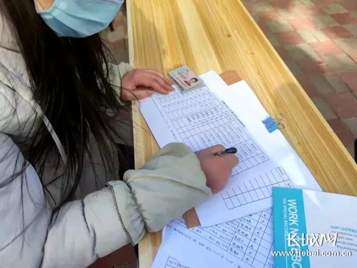 光华社区工作人员正在为居民做登记工作,忙碌一上午,仍然没有吃饭,他们争分夺秒推进核酸检测进度,手在寒风中冻得握不住笔。(长城网记者吴苗苗 摄)