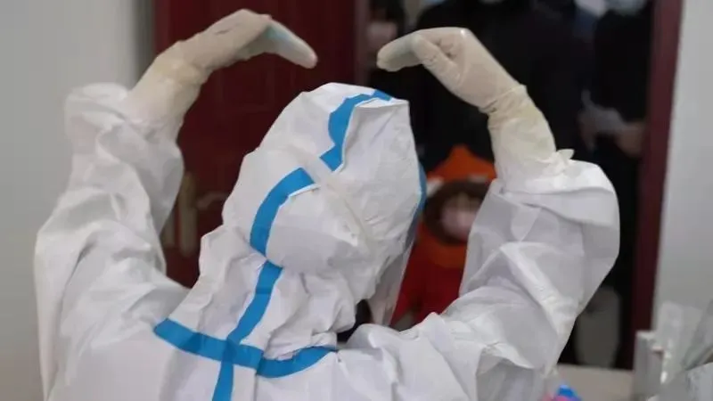 1月6日上午11时,家住石家庄市弘石湾小区的4岁女孩乐乐(化名)做完核酸检测后,迟迟没有离去。她安静地站在人群后面,久久地望向工作人员,而后深深地鞠了一躬。省二院的护士也给小朋友“比心”。