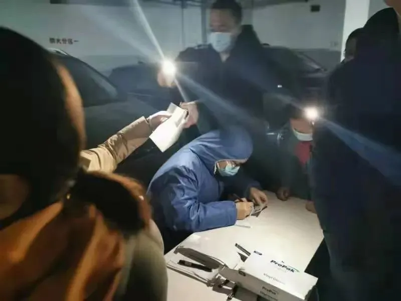 石家庄市天海誉天下小区检测点在地下车库,居民给工作人员点亮手电筒。