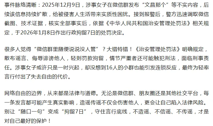 邢台清河县警方最新通报:一名1994年出生的女子,因在16人微信群发布针对他人的谣言,信息经朋友圈多次转发后造成严重影响,最终被依法行政拘留7日!这起案例再次印证:网络不是法外之地,随口造谣真的会付出代价!