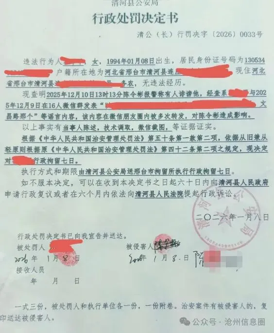 邢台清河县警方最新通报:一名1994年出生的女子,因在16人微信群发布针对他人的谣言,信息经朋友圈多次转发后造成严重影响,最终被依法行政拘留7日!这起案例再次印证:网络不是法外之地,随口造谣真的会付出代价!