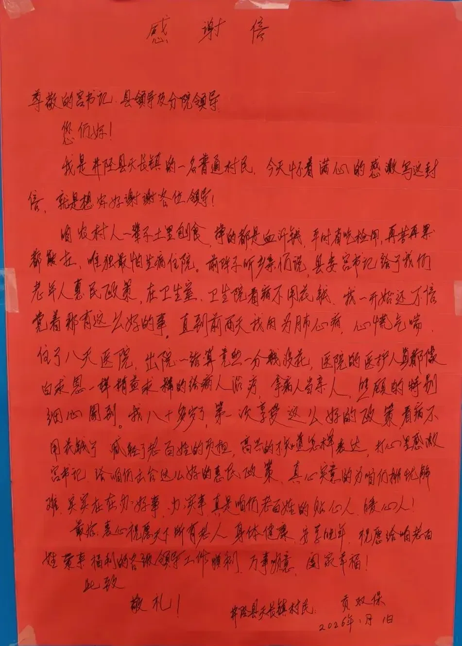 八天的住院经历,彻底打消了老人的所有顾虑。主管医生段春亮精准诊疗,护士们全程细心照料,老伴不在身边的时候,还主动帮忙打饭送水,检查、取药等流程更是全程引导,不用他多跑一步路。“比自家儿女想得还周到!”老人感动地说。出院结算时,“一分钱不用交”的消息让他瞬间红了眼眶,反复向工作人员确认后,激动得连连作揖。出院后,贡双保第一时间找来大红纸,一笔一划写下感谢信送到医院:“不光是谢政策,更要让乡亲们都知道这个好消息!”老人的举动,道出了众多受益群众的心声。