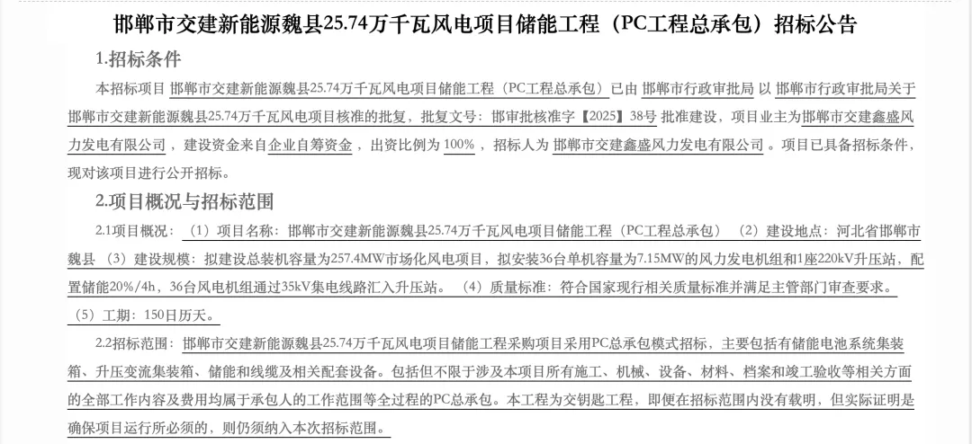 根据招标公告,邯郸市交建新能源魏县25.74万千瓦风电项目,拟建设总装机容量为257.4MW市场化风电项目,拟安装36台单机容量为7.15MW的风力发电机组和1座220kV升压站,配置储能20%/4h,即51.48MW/205.92MWh,36台风电机组通过35kV集电线路汇入升压站。