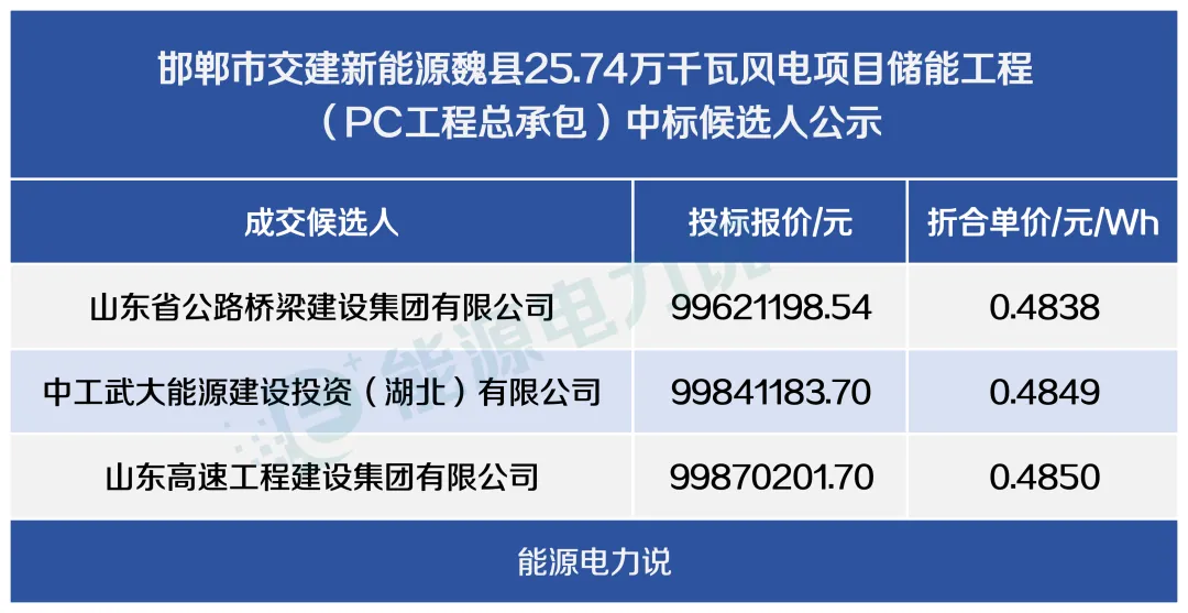 最后为,山东高速工程建设集团有限公司,由山东路桥(67.9%控股)、北京通盈工融一号股权投资基金合伙企业(有限合伙)共同出资设立,投标报价99870201.7元,折合单价约0.4850元/Wh。