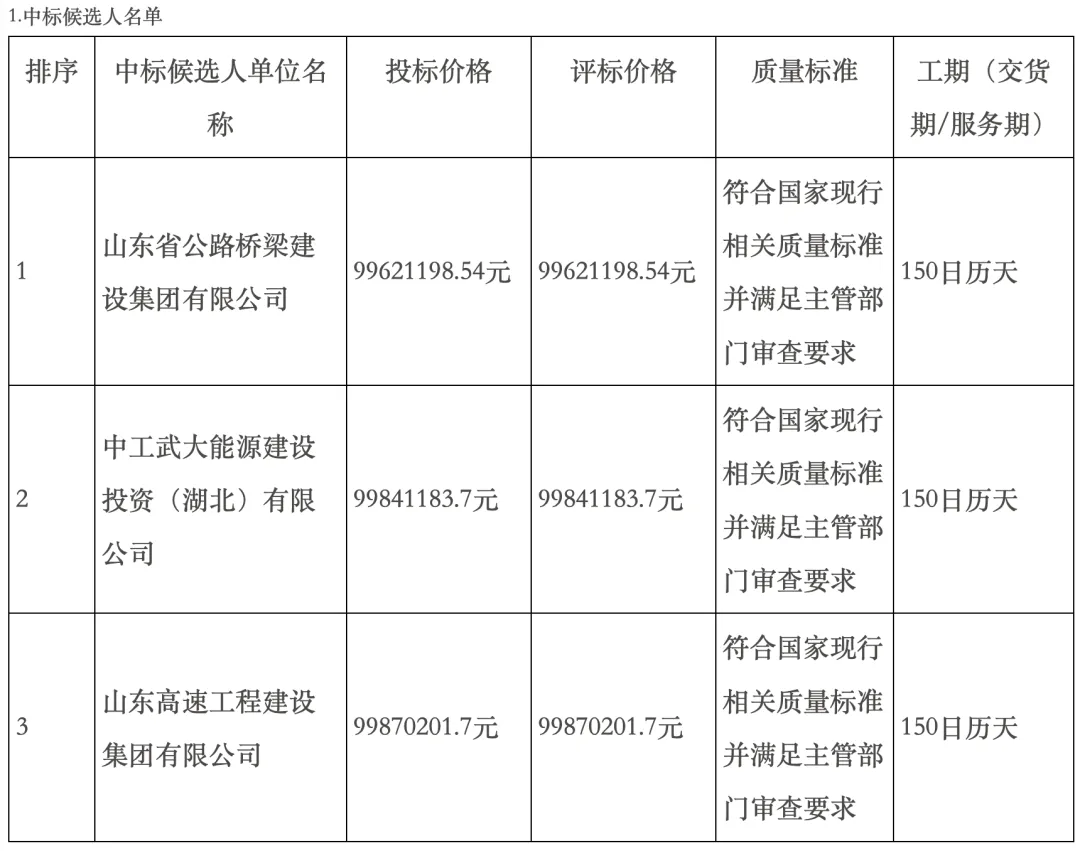 公示的三家中标候选人,排名第1的是,山东省公路桥梁建设集团有限公司,由山东高速路桥集团股份有限公司(山东路桥 000498.SZ,山东高速集团控股上市公司)、中银金融资产投资有限公司共同出资设立,投标报价99621198.54元,折合单价约0.4838元/Wh。