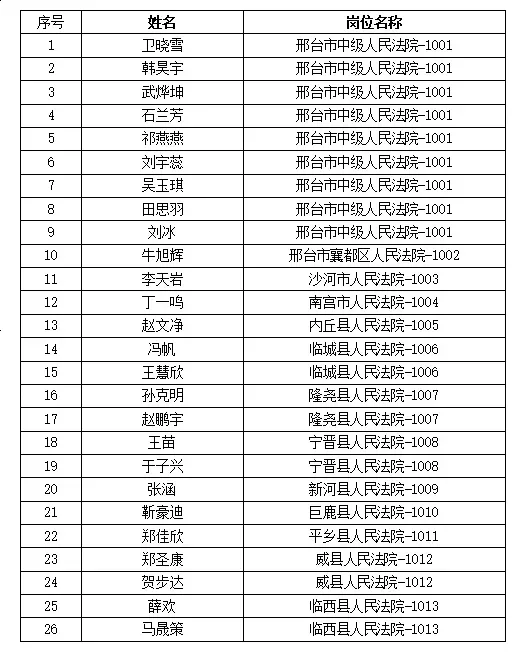 邢台市法院、检察院公开招聘聘用制书记员拟聘用人员名单公示