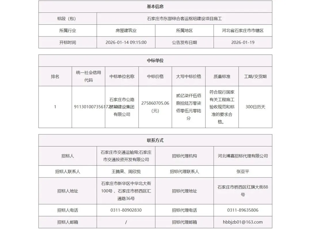 【中标公告】石家庄市东部综合客运枢纽建设项目施工