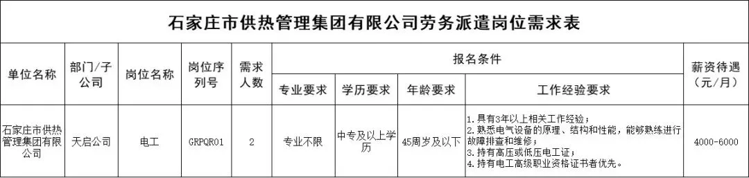 根据工作需要,石家庄市供热管理集团有限公司特委托石家庄市国经人力资源管理有限公司面向社会公开招聘劳务派遣制人员2名。现将具体招聘事宜公告如下: