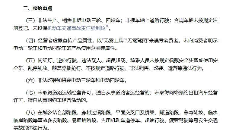 。整治对象包括非标车,即未列入工信部公告、无3C认证、不符安全标准无法注册登记的车辆,以及存在交通违法行为的合规车。整治重点涵盖非法生产销售非标车、非标车上路、合规车未注册投保,经营者虚假宣传误导消费者,还有闯红灯、逆行、非法改装拼装、无证运营,以及在事故多发路段易引发事故的违法行为等。