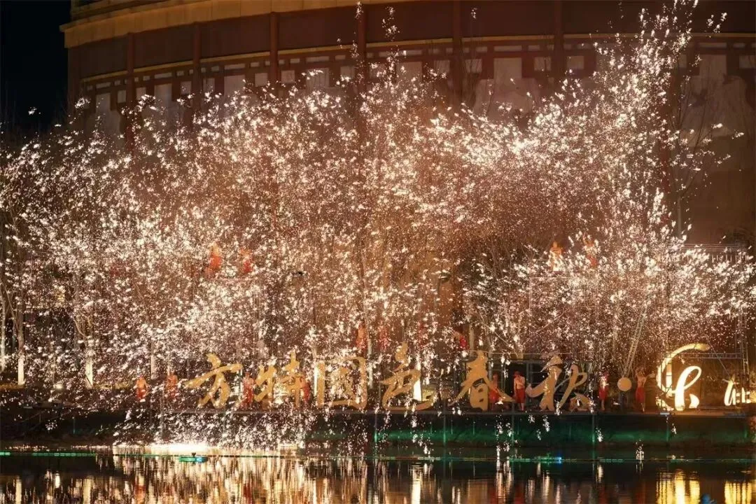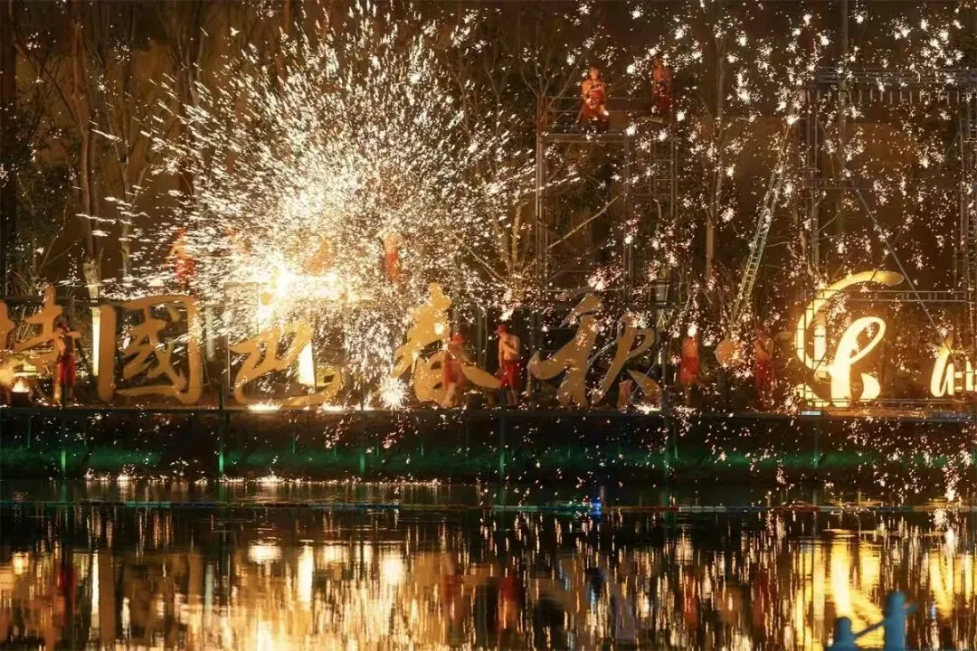 1600℃的铁水泼洒向夜空,铁水化作漫天华彩,火树银花之盛更胜往年三倍,如金色瀑布倾泻而下,点亮整个园区!