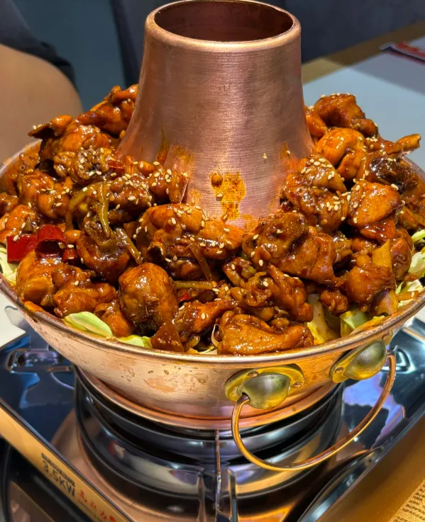 到了晚上,主角必须是火锅鸡。这不是精致料理,是粗犷的快乐。铜锅炭火,红油翻滚,鸡肉在里面咕嘟咕嘟地炖着,满屋子都是那种霸道的香味。还有大名鼎鼎的河间驴肉火烧,长条形的酥皮,咬一口掉渣,肉香在舌尖炸开,那一刻你会觉得,减肥的事儿明天再说吧。