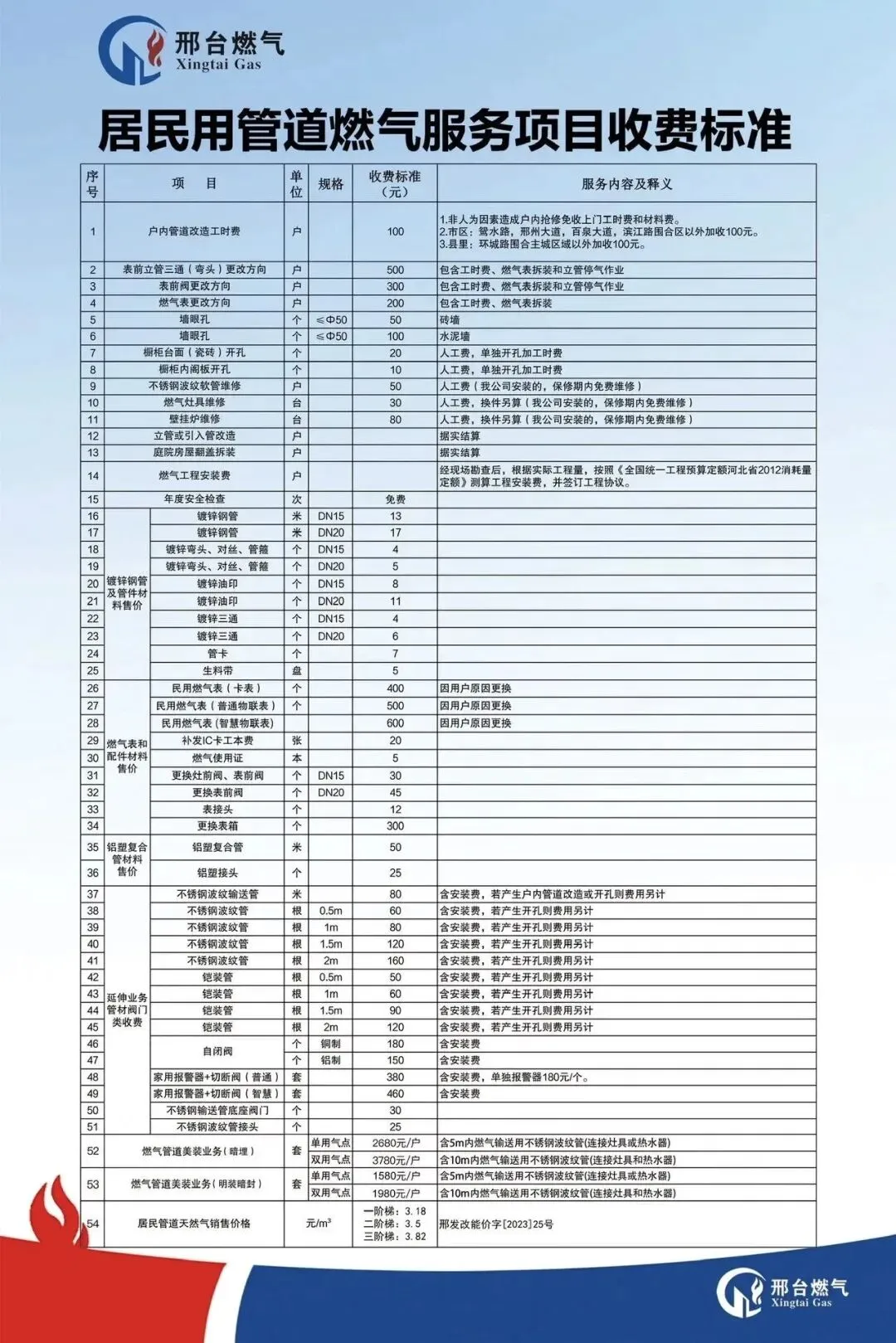 其中,居民管道天然气销售价格以邢发改能价字〔2023〕25号文件,共分三档价格,第一阶梯3.18元/立方米,第二阶梯3.5元/立方米,第三阶梯3.82元/立方米。