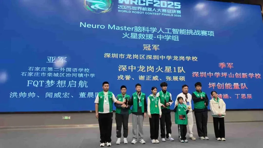 世界机器人大赛总决赛日前在无锡惠山区结束,在汇集21个国家的2.5万余名顶尖选手的巅峰对决中,石家庄有四支代表队参加,最终获得了具身智能挑战项的NeuroMaster火星救援赛项的小学组冠军和中学组亚军。