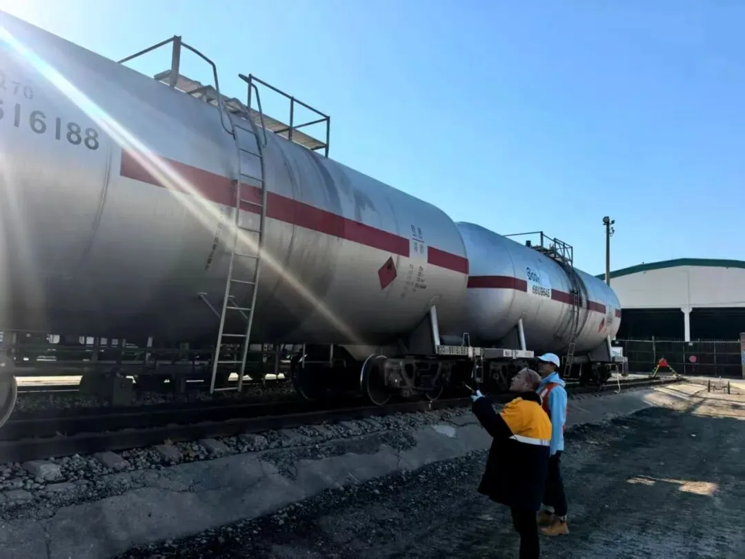 八里庄营业部加强重点货物现场盯控,对在站罐车逐一进行外观检查与状态核验,确保重点货物运输环节安全可控。(八里庄营业部供稿)