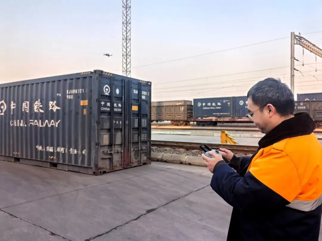 磁山营业部积极探索无人机检车新方式,组织开展专项测试,运用无人机高效检查集装箱外观及密封状态,提升查验效率与精准度。(磁山营业部供稿)