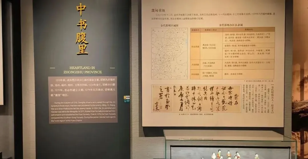 1213年秋。成吉思汗兵分三路扫荡金王朝,邯郸为兵锋所掠,洛州、磁州、相州、卫等州相继沦陷,1234年金亡,邯郸尽归蒙古。1271年,忽必烈建立元朝,1279年元灭南宋,邯郸属元朝“腹里”地区。
