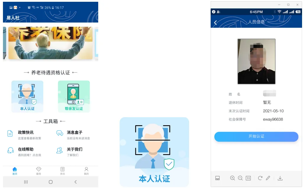 要求每个村街安排3-4名熟悉认证的人员指导每个家庭至少有一名成员(年轻人),用安卓手机下载“易人社系统”认证软件,给认证人员用户注册,通过摄像头轻扫人脸,与认证系统信息比对自助认证。下次认证不需下载和注册,用手机通过“易人社系统”软件进行扫脸认证。
