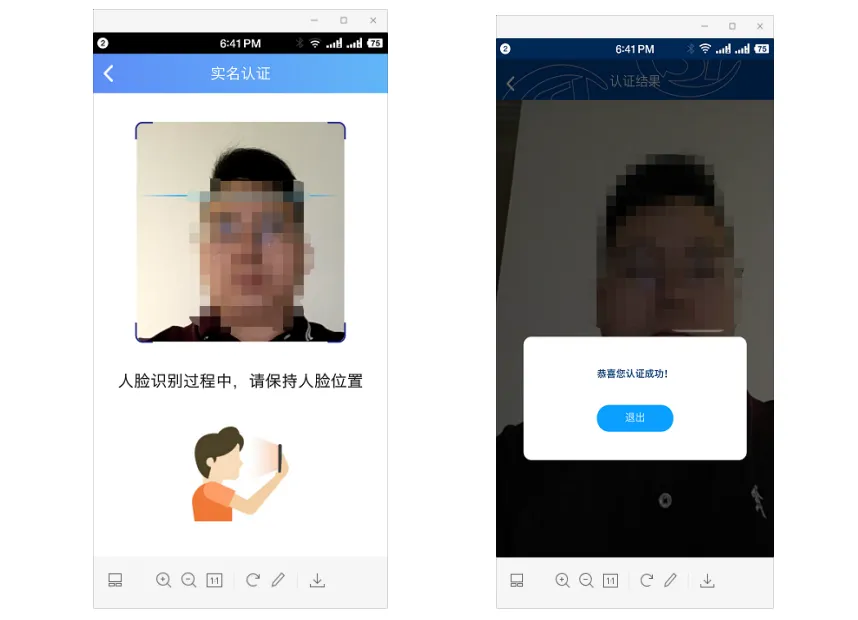 开始刷脸,确保光线充足,正脸对准取景框,等待扫描线检测,完成刷脸,提示“恭喜您认证成功”,表示本次认证周期资格认证已完成。