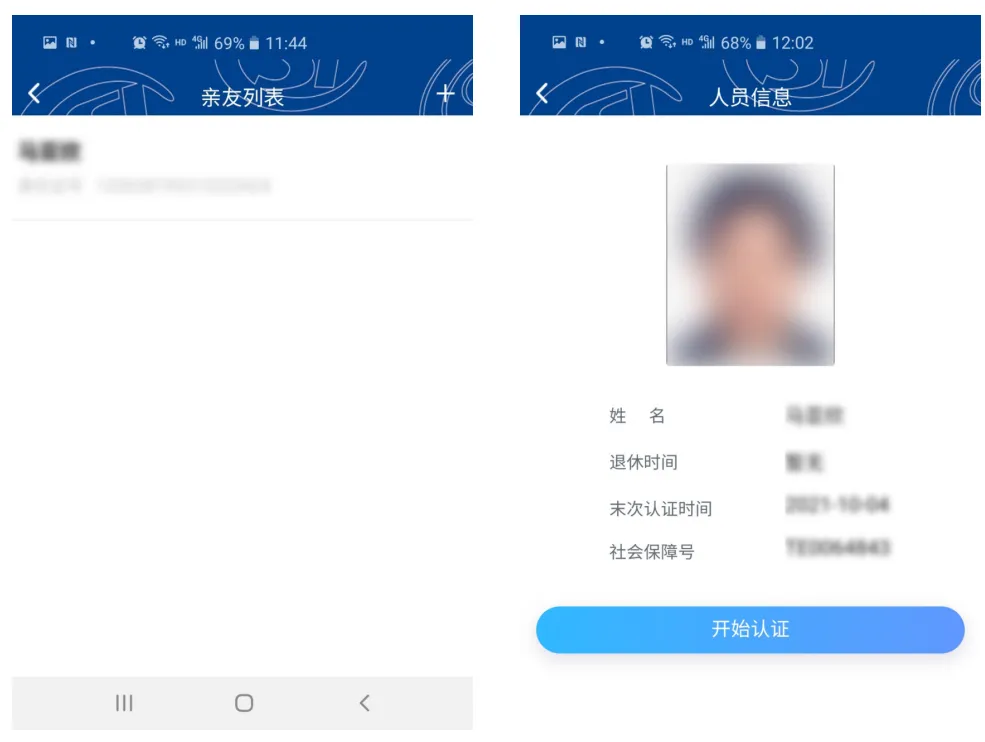 已经新增成功的亲友,直接点击列表中姓名,即可进入认证界面,点击开始认证,按提示操作,即可完成认证。