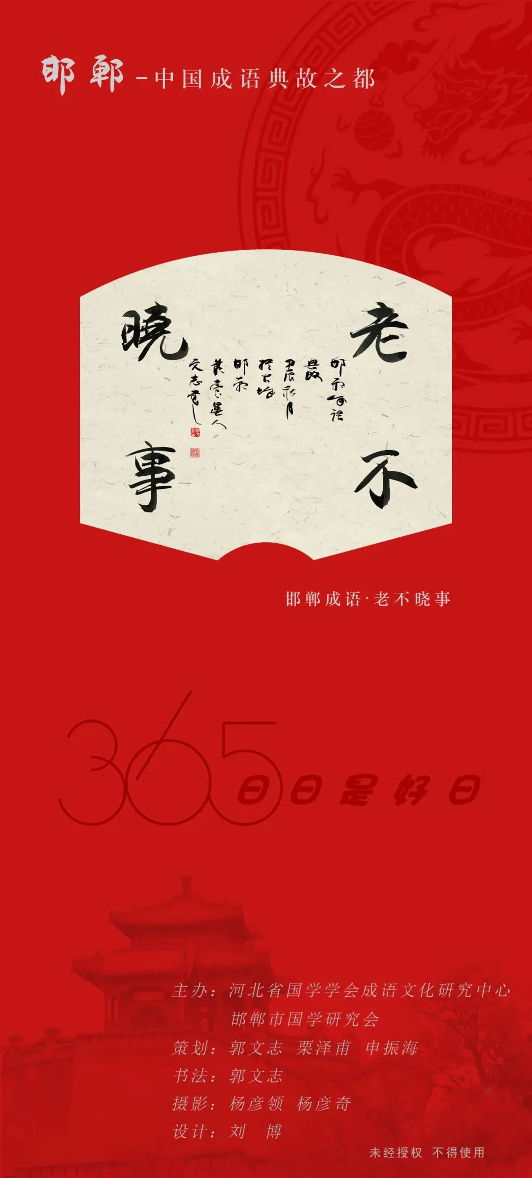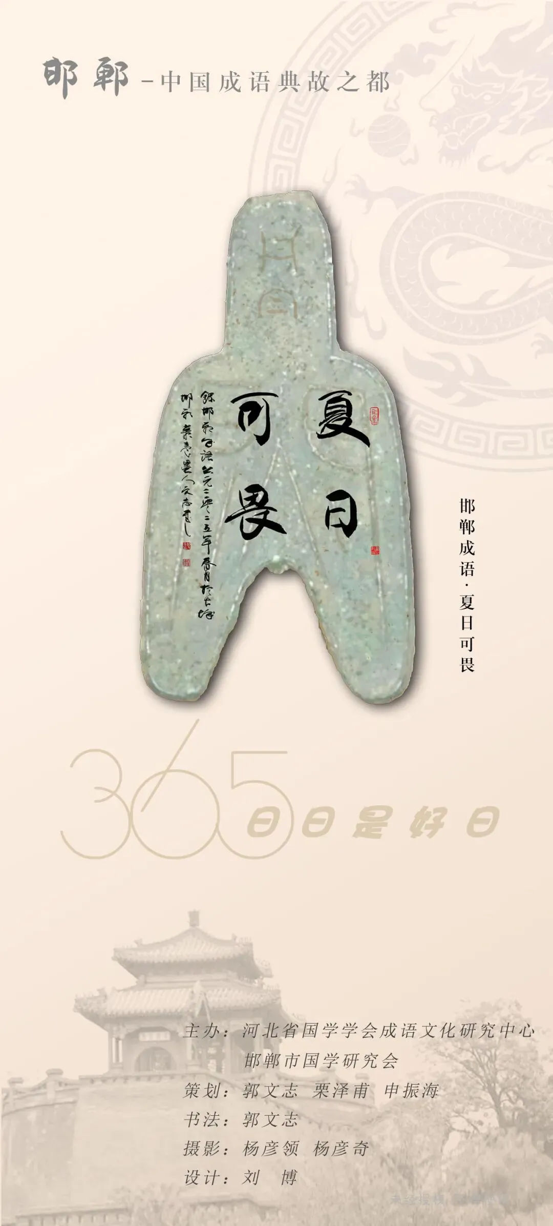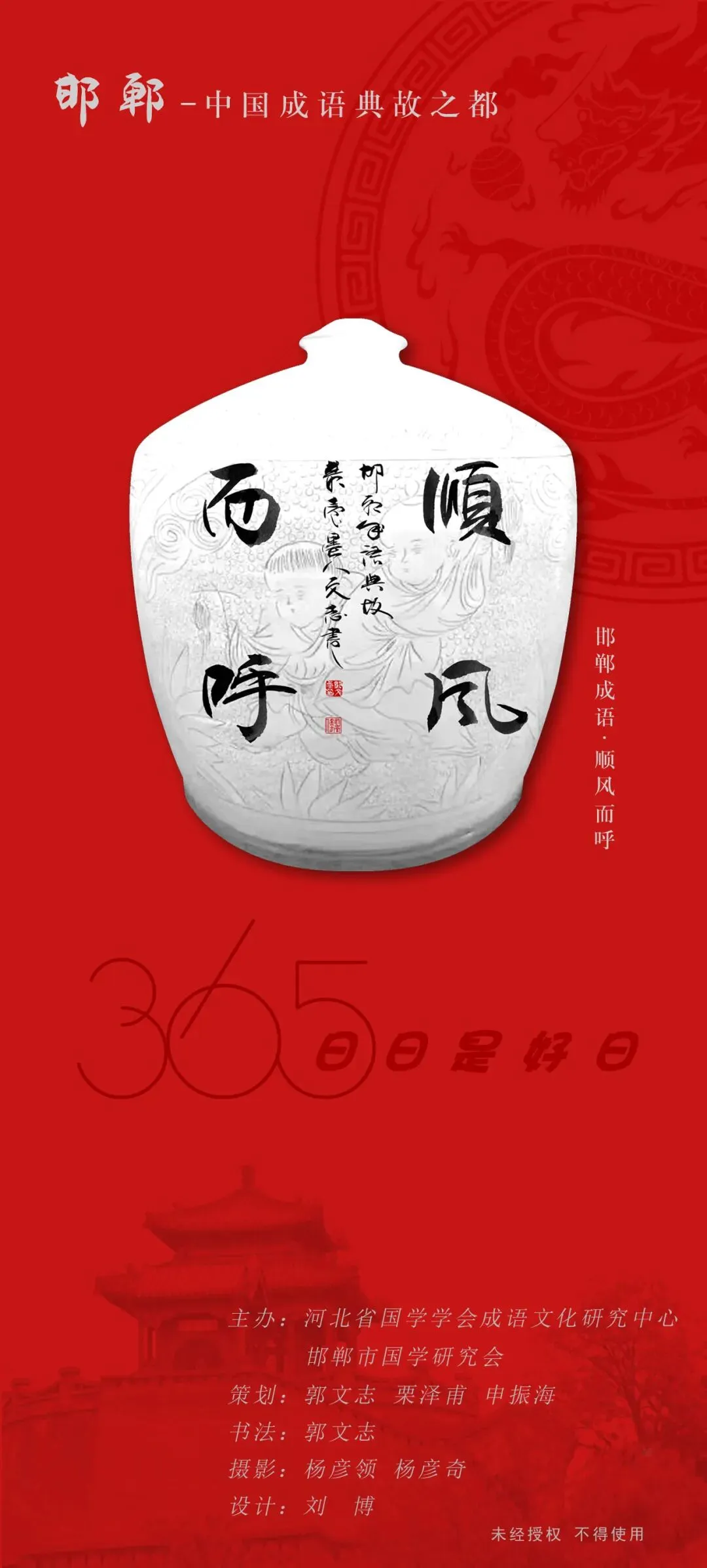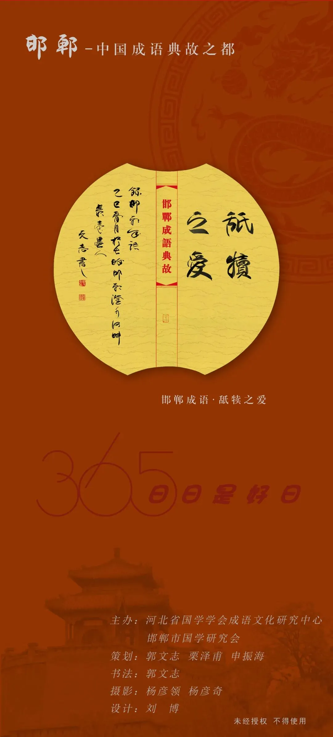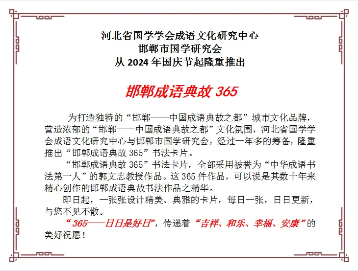 为打造独特的“邯郸——中国成语典故之都”城市文化品牌,营造浓郁的“邯郸——中国成语典故之都”文化氛围,河北省国学学会成语文化研究中心与邯郸市国学研究会,经过一年多的筹备,隆重推出“邯郸成语典故365”书法卡片。