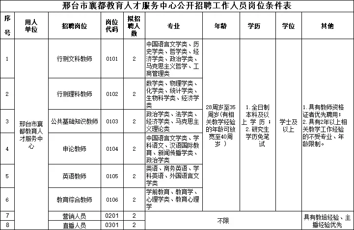 2.教师岗位要求:年龄在28周岁以上35周岁以下(有相关教学经验的年龄可放宽至40周岁),全日制本科学历及以上学历。岗位信息详见《邢台市襄都教育人才服务中心公开招聘工作人员岗位条件表》;