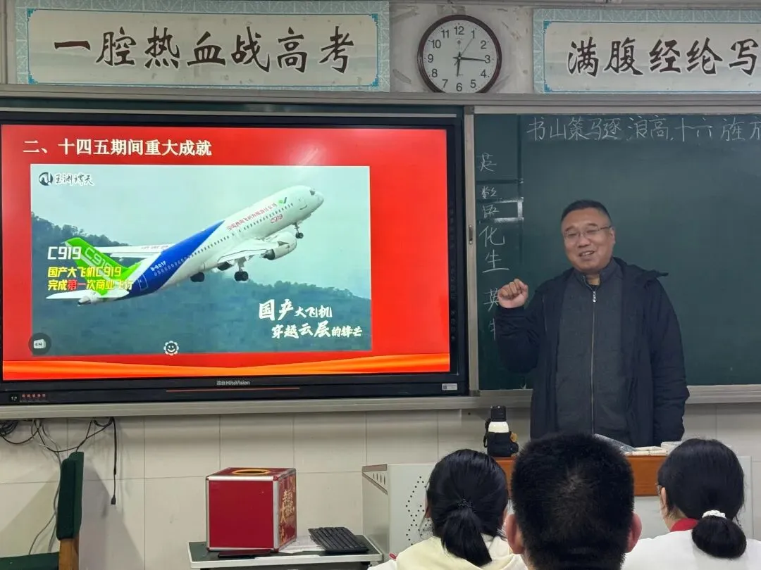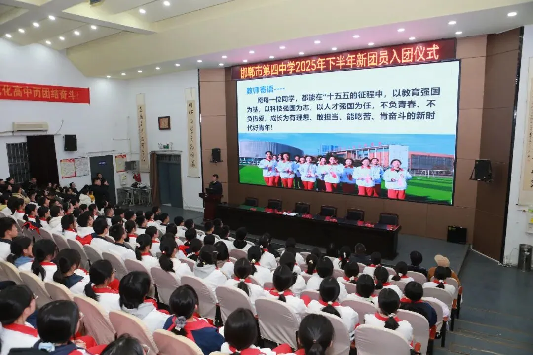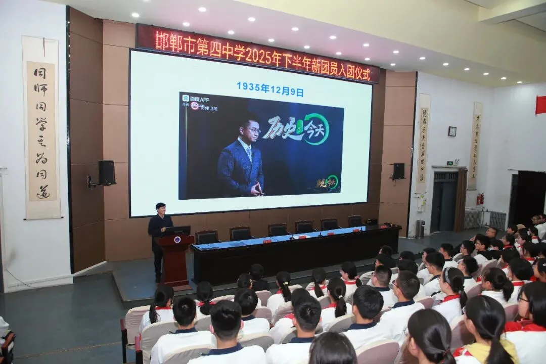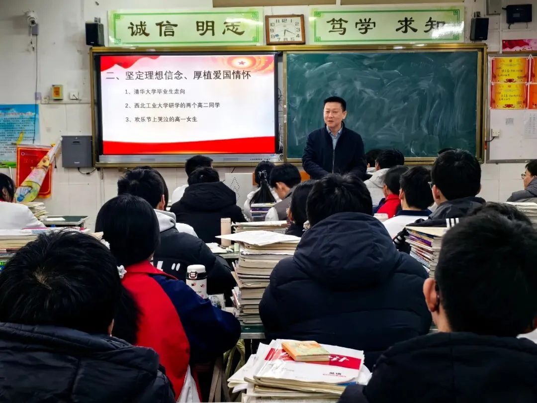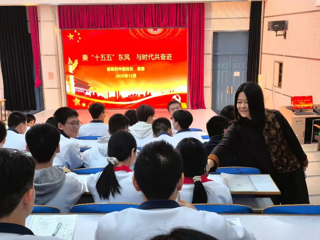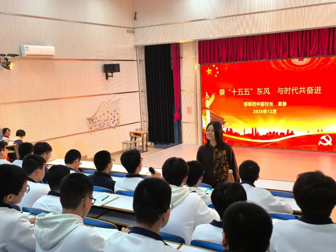 邯郸四中校长李峰以“筑牢思想根基,担当强国使命”为主题,解读“十四五”“十五五”谋划的关键节点,引导青年学生树立正确的世界观、人生观、价值观。李峰校长结合校园新增的数字化实验室、智慧黑板,以及邯郸街头日益增多的新能源汽车等身边实例,让学子切实感受“十四五”规划带来的生活便捷与发展红利。他向青年学生发出号召:一要筑牢思想根基与理想信念;二要锤炼可堪大用的过硬本领;三要厚植深沉真挚的家国情怀。最后,他寄语学子:做理想的追梦人,将个人追求融入国家发展和民族复兴的伟大事业,努力成为德智体美劳全面发展的社会主义建设者和接班人。