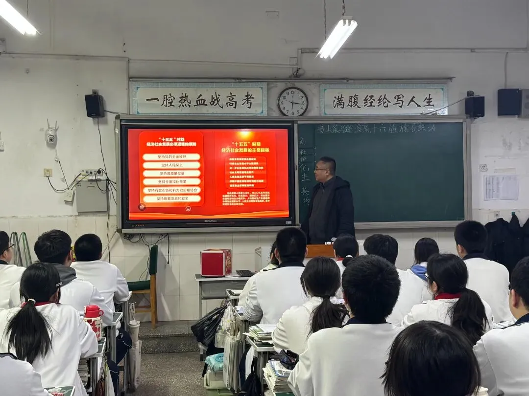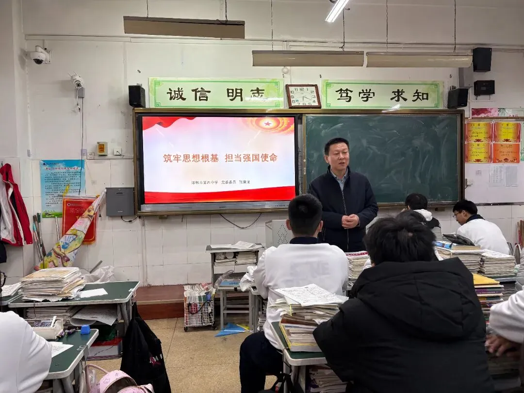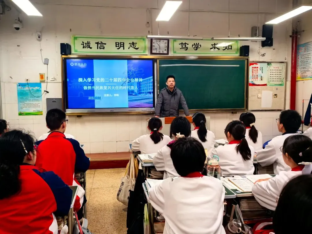 邯郸四中副校长裴力杰以“筑牢思想根基,担当强国使命——党的二十届四中全会精神专题思政课”为主题,深入梳理中国脱贫攻坚的坚实足迹,探寻筑牢思想根基的青春密钥。裴力杰副校长指出,党的二十届四中全会擘画了国家发展的宏伟蓝图,青年学子应将个人理想融入民族复兴大局,勇担青春使命,在青春赛道上奋力奔跑。他号召学子:一要从榜样身上汲取力量,锤炼青春初心;二要将个人兴趣与文化传承使命相结合;三要立足当下、脚踏实地,努力成为各行各业的中坚力量,在强国建设、民族复兴的伟大征程中绽放绚丽光彩。