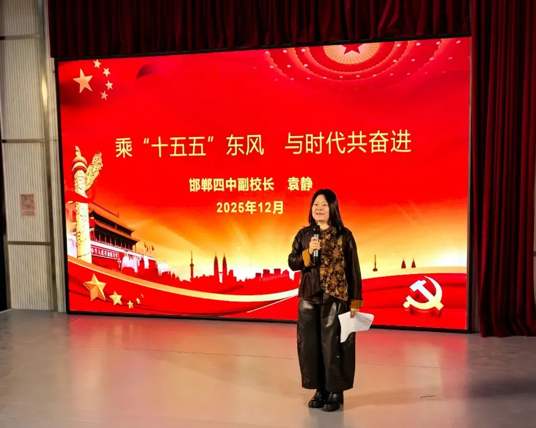 邯郸四中副校长袁静以“乘十五五东风,与时代共奋进”为主题,通过沉浸式视频播放,让青年深刻感受中国经济正处于新动能转化的关键拐点,真切体会“十四五”期间国家取得的辉煌成就。袁静副校长带领学子共同回顾五年间的发展硕果:工业制造迭代升级、太空征程再续新篇、国家迈入智能新纪元、中国形象提升进入加速度。她强调,“十五五”不仅是国家发展的新起点,更为每个人的成长创造了新机遇,每个五年都会涌现一批与时代同频共振的奋斗者。最后,她寄语青年学生把握时代机遇、与时代共舞,不负时代、不负历史、不负人民。