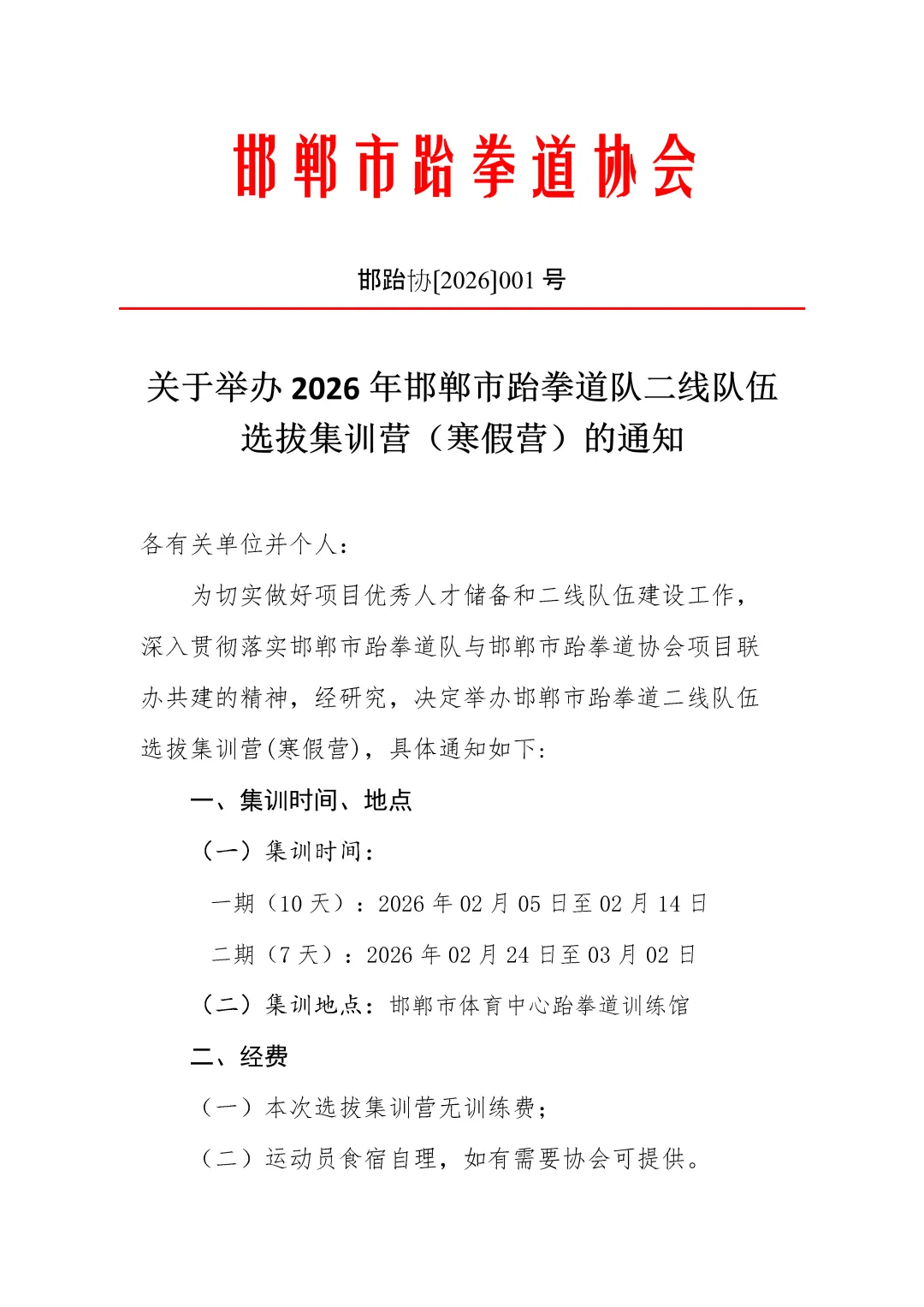 关于举办2026年邯郸市跆拳道队二线队伍选拔集训营(寒假营)的通知