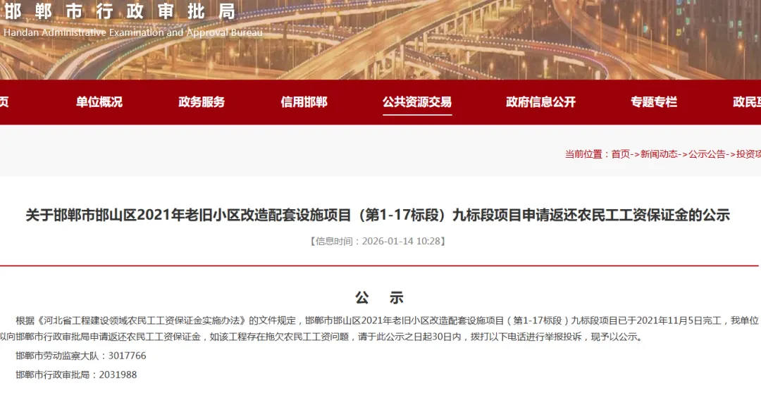 根据《河北省工程建设领域农民工工资保证金实施办法》的文件规定,邯郸市邯山区2021年老旧小区改造配套设施项目(第1-17标段)九标段项目已于2021年11月5日完工,我单位拟向邯郸市行政审批局申请返还农民工工资保证金,如该工程存在拖欠农民工工资问题,请于此公示之日起30日内,拨打以下电话进行举报投诉,现予以公示。