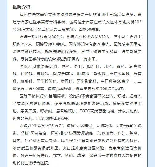 【石家庄招聘】石家庄医学高等专科学校附属医院招聘