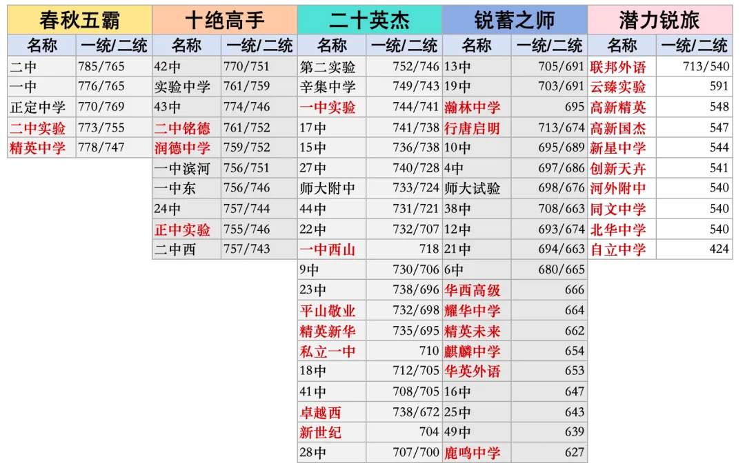这一档代表了全市最高水平,是无数学生和家长心中的“梦校”。二中以785/765的断层式数据稳居榜首,展现了绝对的统治力。精英中学778/747紧随其后,其严格的管理模式和亮眼的升学成绩有口皆碑。还有一中、正定中学、二中实验,每一所都是省内响当当的招牌,清北等顶尖高校的输送大户。十绝高手:稳扎稳打的实力派
