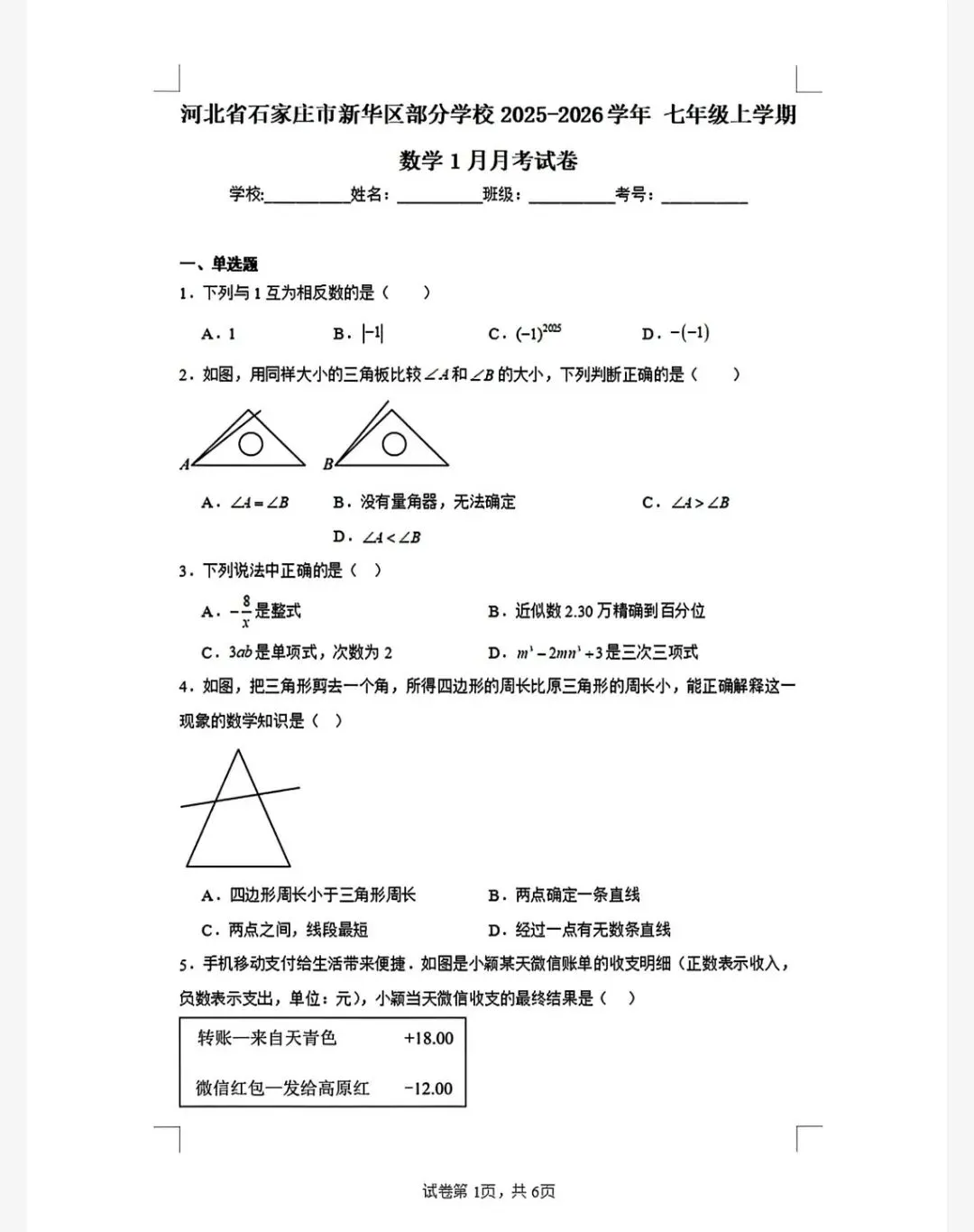 【七上期末】 2025-2026学年河北省七年级上学期期末考试数学试卷含答案(冀教版)