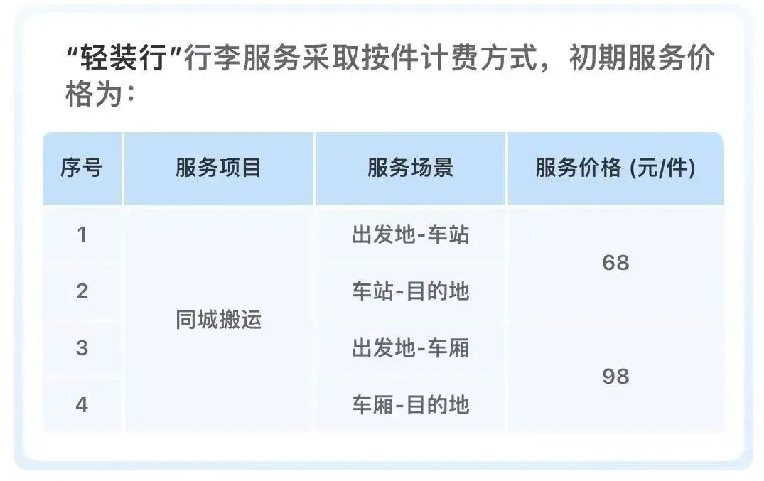 “轻装行”行李服务采取按件计费方式,试点期间服务价格为: