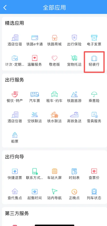 第一步:打开铁路12306App或者微信小程序,在首页中部应用处往左滑,找到“全部应用”,点击进入后找到【轻装行】模块。