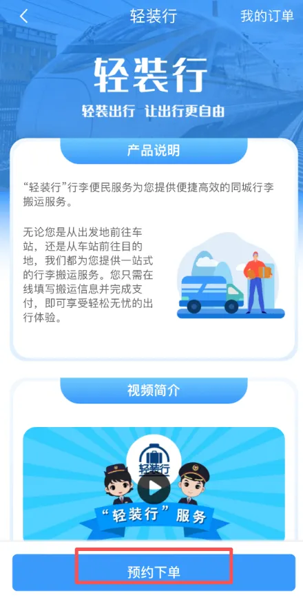 第二步:点击【轻装行】,页面会弹出“轻装行”办理流程介绍,仔细看完后,点击【预约下单】。