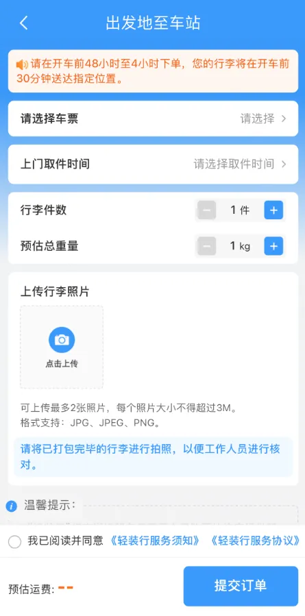 已购车票的旅客可通过铁路12306APP、微信小程序及中铁快运微信小程序预约“轻装行”服务。