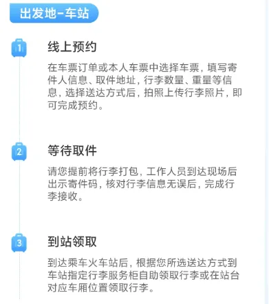 办理从出发地到车站的业务,可在开车前48小时至4小时预约,由工作人员到旅客指定位置上门收取符合托运规定的行李并搬运至出发车站,通过安检后,按照预约要求,在开车前30分钟将行李存入服务柜或在开车前10分钟送至站台。
