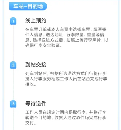 由工作人员从旅客乘车站台或旅客指定的站内行李服务柜(服务台)收取行李,在5小时内送达旅客指定位置,收货人通过取件码完成行李交付。