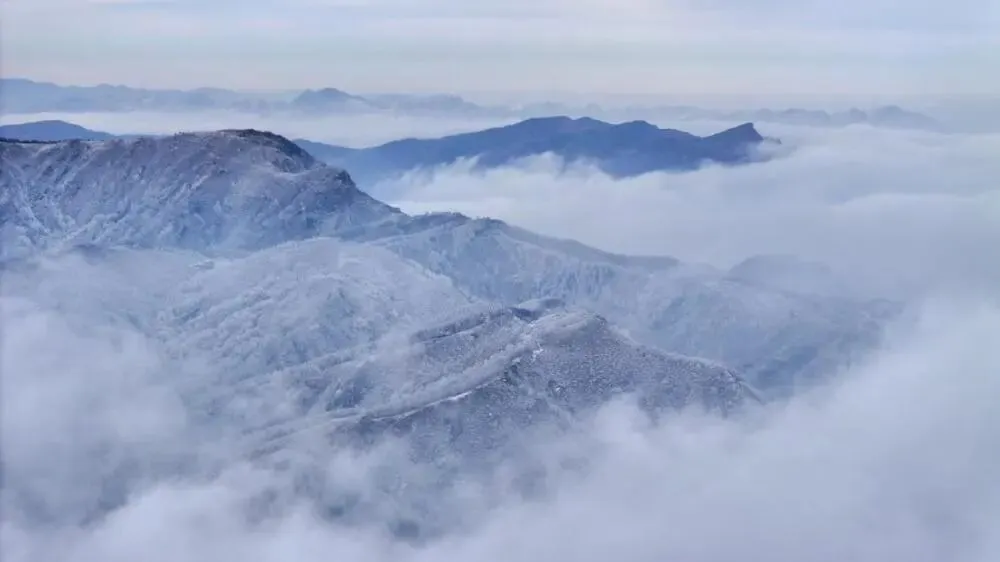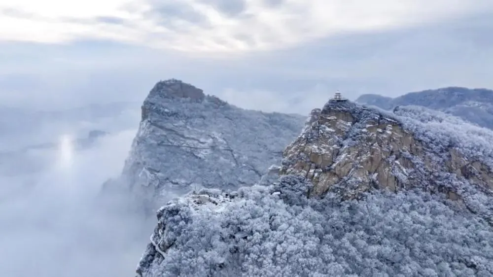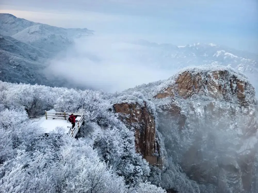 1月19日,一场冬雪过后,河北省灵寿县五岳寨景区的群峰被冰雪覆盖,陡峭的岩壁与茂密的树林银装素裹,在云海间若隐若现,宛如一幅水墨画卷。