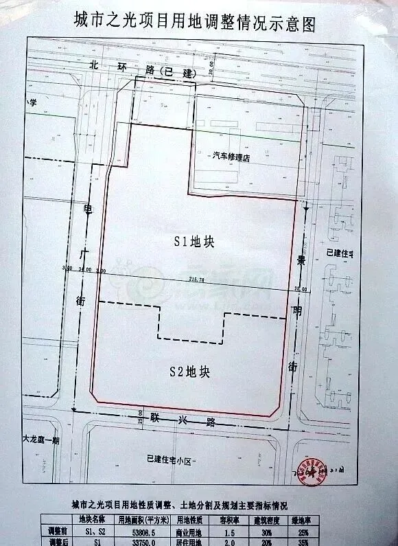 调整前 S1、S2合并 53808.5 商业用地 1.5 30% 25%