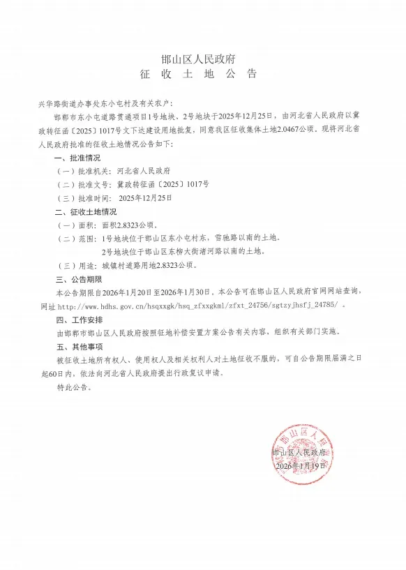 近日邯山区政府发布征地公告,涉及东小屯村及