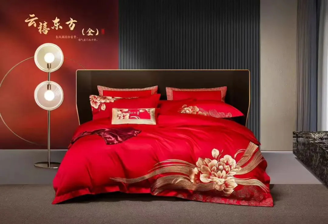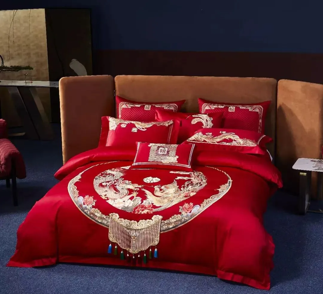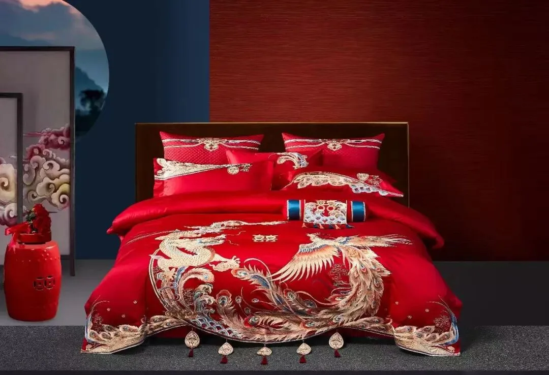 • 红色龙凤套件:婚礼当天铺床撑场面,红得喜庆又大气,契合“红红火火”的婚俗;