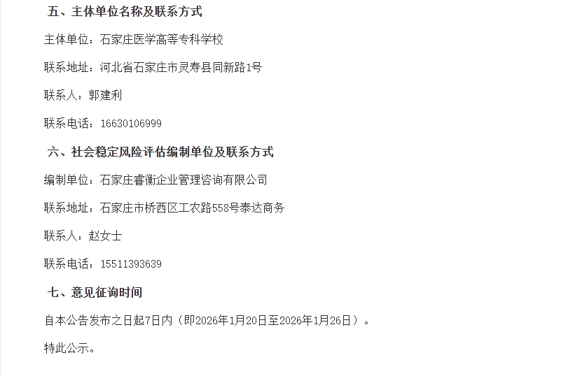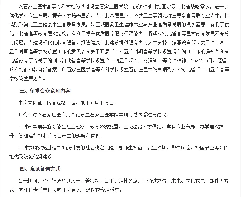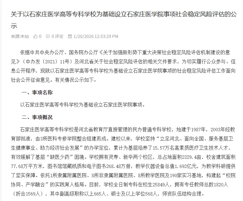 1月20日,石家庄医学高等专科学校正式发布《关于以学校为基础设立石家庄医学院事项社会稳定风险评估的公示》。公示提到,现就以石家庄医学高等专科学校为基础设立石家庄医学院事项的社会稳定风险评估工作面向社会公开征询意见。