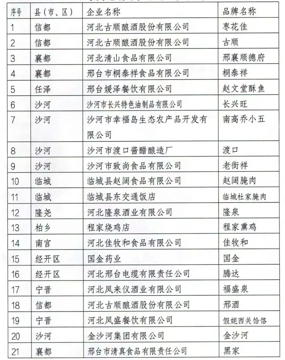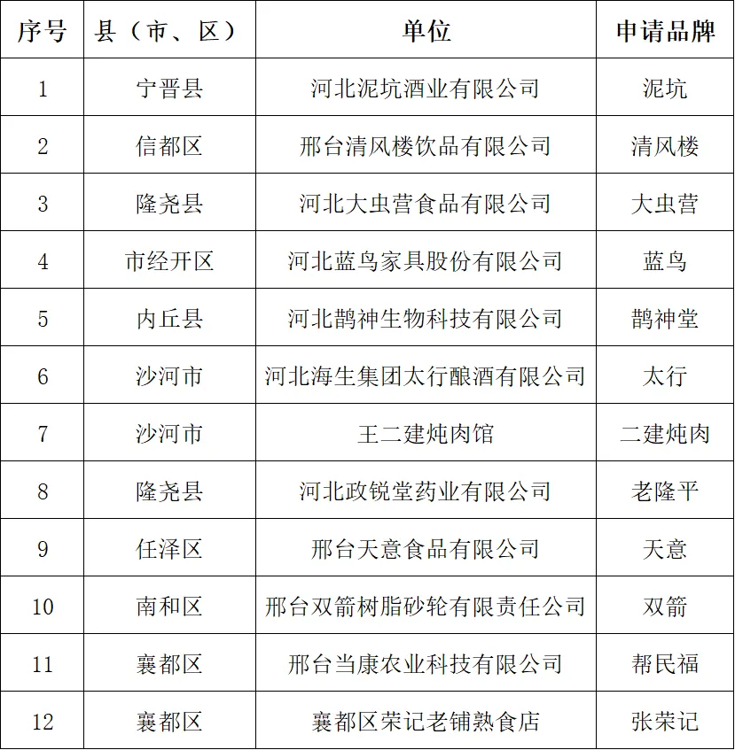 近日,第二批邢台老字号名单公布,河北泥坑酒业有限公司的泥坑品牌、邢台清风楼饮品有限公司的清风楼品牌、河北大虫营食品有限公司的大虫营品牌等12个品牌入选。目前,我市一共认定了33个邢台老字号品牌。
