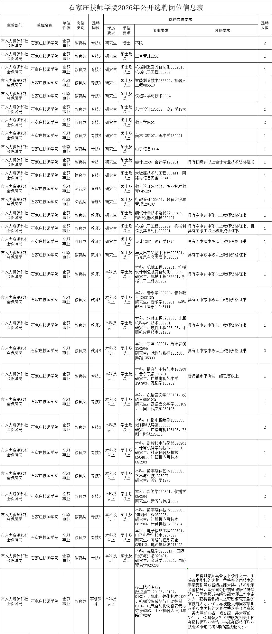 拟公开选聘事业单位工作人员36名,其中任课教师34名,管理岗2名。选聘的岗位、数量和选聘要求详见《石家庄技师学院2026年公开选聘岗位信息表》(见附件1)。